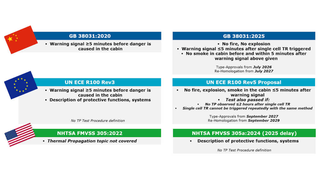 As lithium-ion batteries become the backbone of modern vehicles and energy systems, safety, alongside cost, has emerged as a defining challenge for EVs, stationary storage, next-generation aviation, power tools, and beyond. High-profile incidents including thermal runaway events, system failures, and the battery plant fire in Moss Landing, CA, have accelerated the push for stricter safety regulations (see Fig. 1). From a global perspective, China’s upcoming battery safety regulations are slated to be significantly more stringent mandating no fire and no explosion (see Fig. 2). European and U.S. markets are expected to follow China’s regulatory lead.