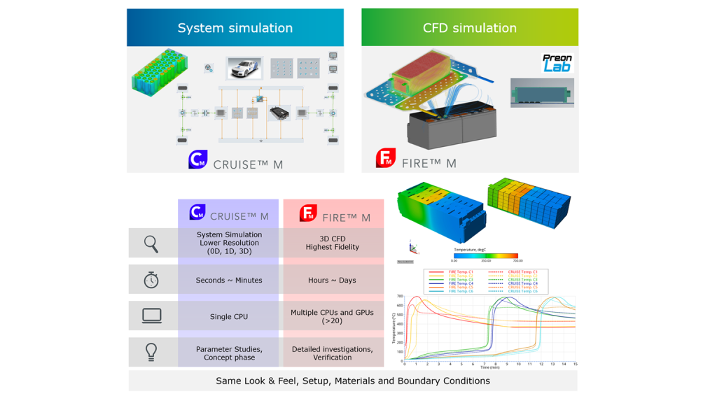 To meet these evolving regulations and to help ensure battery thermal safety across all applications, AVL has developed a “No Flame-Out” pack design that embodies all the above concepts. This design was made possible through a “three-legged stool” approach, which combines simulation, empirical testing, and analytics. By employing an integrated approach combining multi-scale simulation, rigorous safety testing, and data-driven analytics, engineering teams can develop safer, more compliant battery designs on a shorter time scale. In the following sections, we will take a deeper look into this approach, including examples of model validation and advanced methods leveraging AI.